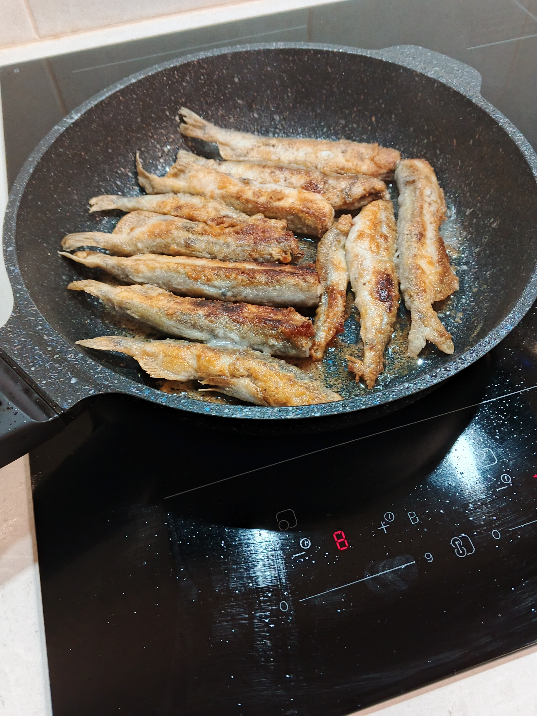У меня на сковородку умещается ровно 10 рыбок.