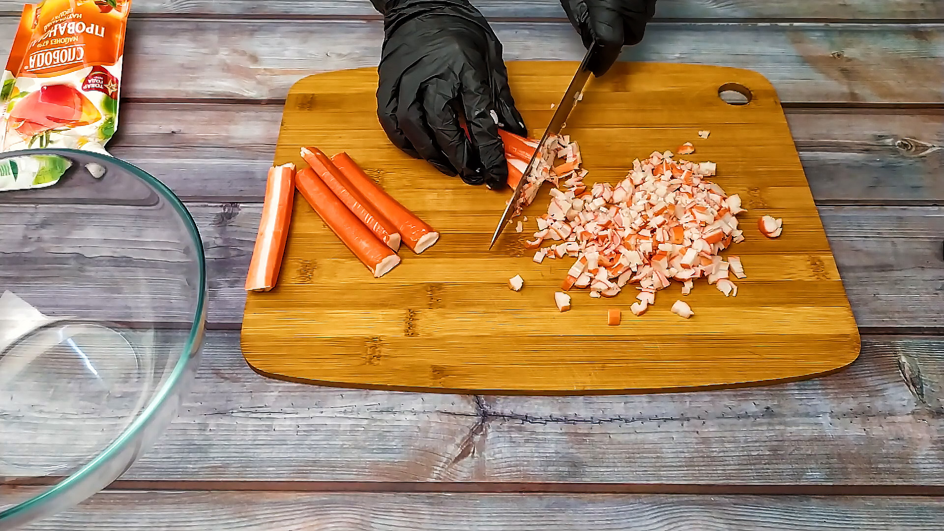 Мелко шинкуем 200 грамм крабовых палочек, заправляем 1 столовой ложкой майонеза и перемешиваем.