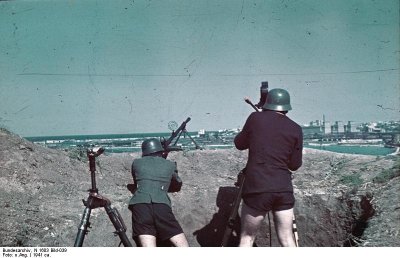 Какой это город? Что снимает немец в черном кителе? Почему у второго пулемет с зенитным прицелом?