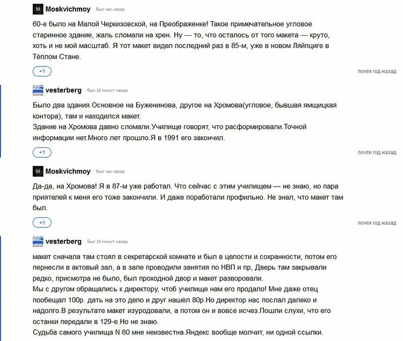 ПТУ находилось в районе Преображенки, вспоминает Мэтр. Приехал я туда, встретили директор и завхоз. Макет стоял в служебном помещении под лестницей, поставленный на попа и разобранный на три части.