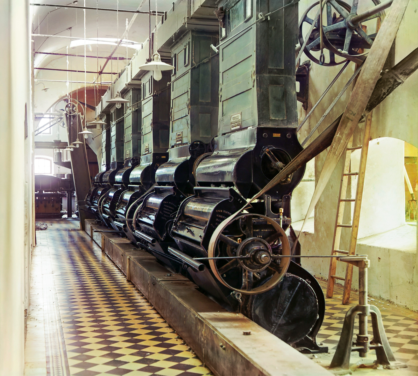 В соседнем цехе стояли машины другого типа, которые уже скатывали очищенный хлопок в рулоны. Их приводил в действие общий вал, который, в свою очередь, вращался приводным ремнём. Чаще всего в те годы изначальным источником энергии была паровая машина, но мы помним, что завод в Байрам-Али — едва ли не самое электрифицированное производство в тогдашней России, поэтому мотор, разумеется, тоже был электрический.
