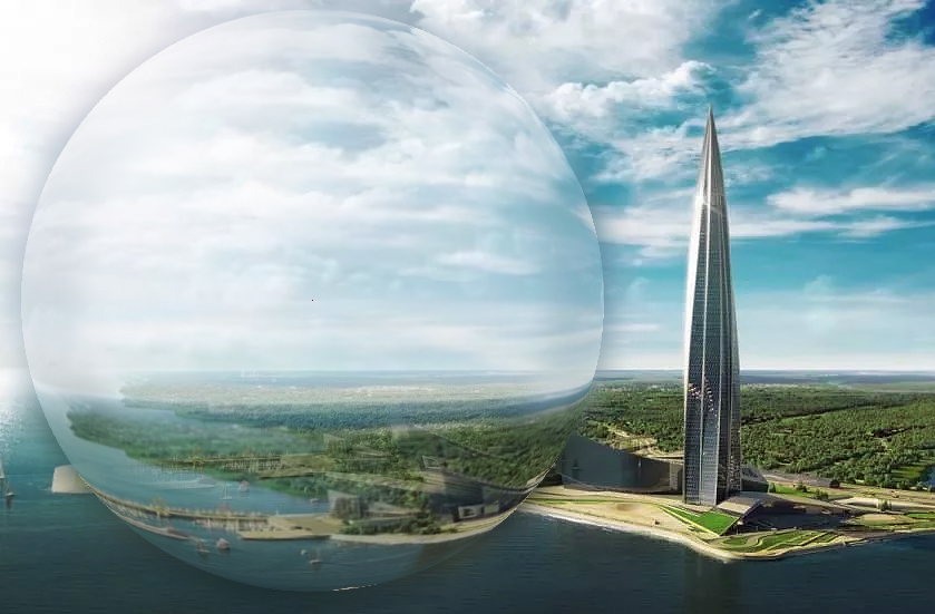 атом, если ядро размером с теннисный мяч в сравнении с Лахта-центром (462 м); само ядро -- красная точка в центре, увеличенная еще в 20 раз