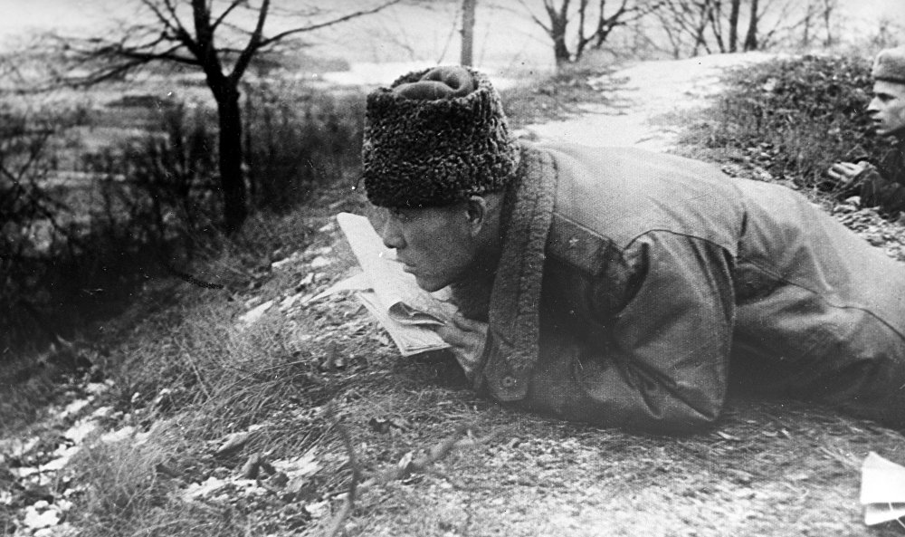 Командир 37-й гвардейской дивизии генерал-майор Сабир Рахимов на рекогносцировке местности перед наступлением