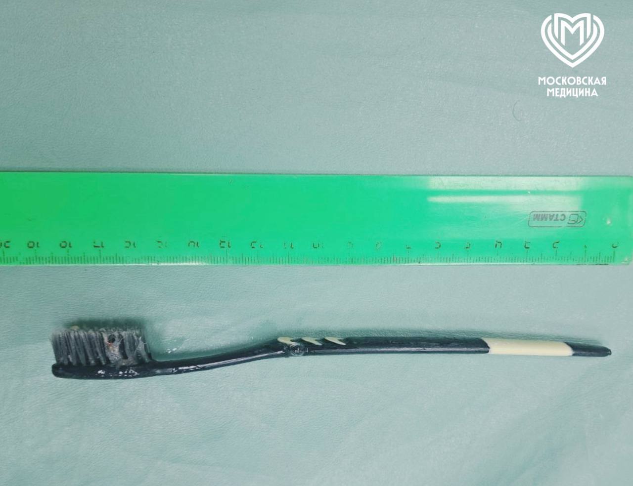 Одним цепким хватом вынуть щетку не удалось: она уже проскользнула в просвет двенадцатиперстной кишки и щетинистым концом там зафиксировалась. Врачи сначала аккуратно высвободили инородное тело, а затем извлекли из желудка.