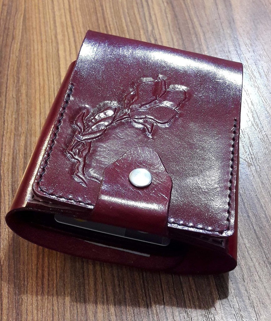 Снаружи "растишка" с ручным окрашиванием и тиснением (веточка магнолии). Краска Толедо Супер, цвет 33009. Краска на растворителе (не на водной основе), поэтому после окрашивания кожу жирую копытным маслом. Иначе суховато получается.