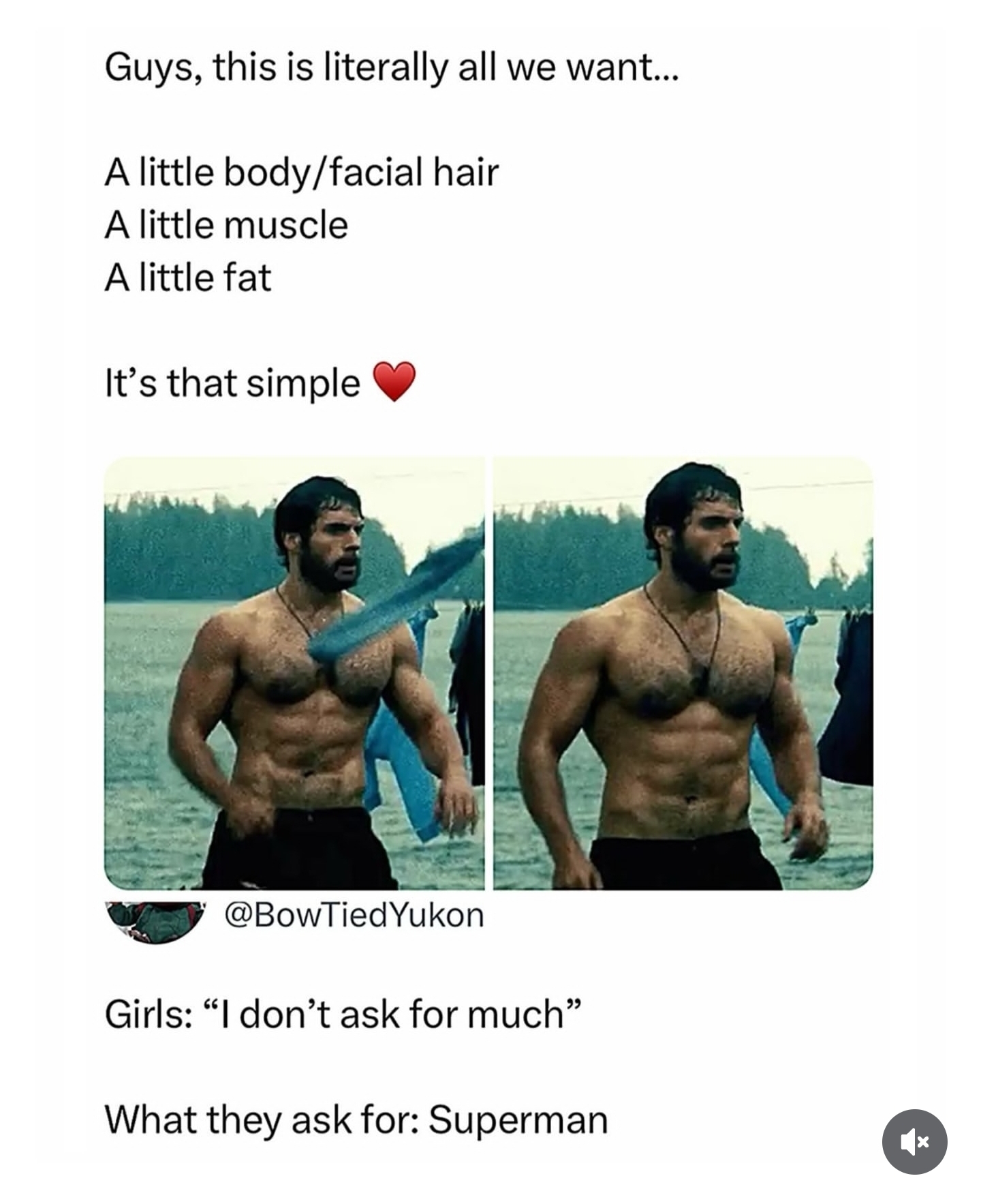 1830 Ryl0n.0b0ev ДЕД ИНСАЙД Противозачаточные шутки Отношения Женщины и их невысокие запросы к мужчинам 6 месяцев назад Ребята, вот это буквально то, что мы хотим:- Немного растительности на теле и лице- Немного мышц- Немного жираЭто так просто!Комментатор:Девушки, такие: "Я не требую многого"Что они требуют: Супермен Мужчины и женщины Из сети Генри Кавилл Английский язык Требования 172 37 5 1 1 1 Ещё 1