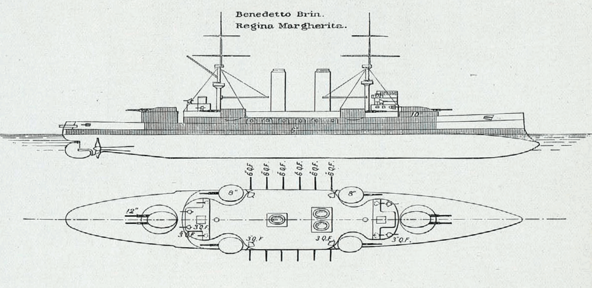 Общая схема броненосцев типа Regina Margherita. Обращает на себя внимание высокая симметричность корабля