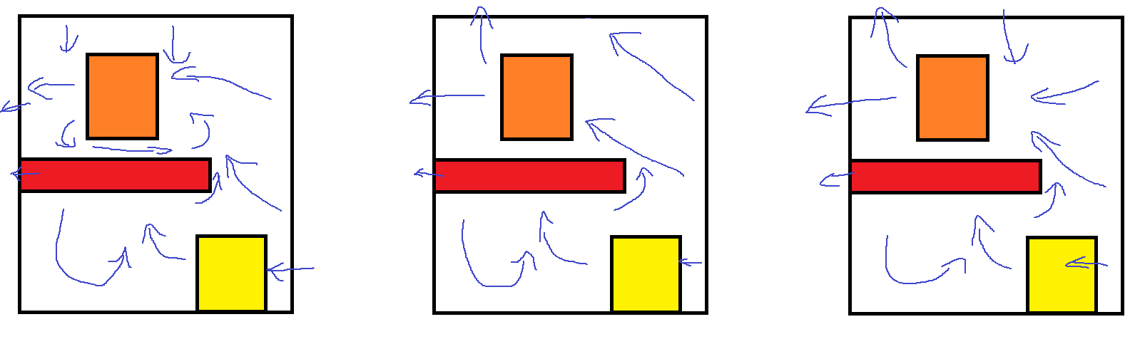 Если вы верхние вертушки направите в разные стороны (правый вариант) это может в теории решить проблему, но придётся что-то оставить над корпусом как бы разделяя вертушки друг от друга, чтоб вихря над системником не было.