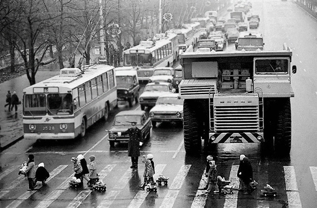 Основанное в едва начавшей восстанавливаться после разрушительной Великой Отечественной войны предприятие в белорусском городе Жодино, всего лишь немногим четверть века спустя прославилось благодаря своей продукции на весь Советский Союз. Белорусский автомобильный завод (БЕЛАЗ) стал символом-брендом не только и не столько одной из союзных республик, сколько синонимом мощи и величия советского государства, воплощенного совершенства достижений инженерной мысли. В год, когда гражданин СССР впервые в мире покорил космос, с конвейера завода сошла первая самостоятельная разработка — 27-тонный грузовик БелАЗ-540. А к 30-му юбилею Победы для динамично развивающейся горнодобывающей промышленности Страны Советов был запущен в серийное производство карьерный автосамосвал БелАЗ-7520 грузоподъемностью 110 тонн. Именно с той поры уникальный облик отличавшегося повышенной проходимостью и надежностью белазовского гигантского грузовика стал широко узнаваем в Советском Союзе и за его пределами. К тому же благодаря таким машинам, способным за один заезд переместить столько же груза, сколько перевез бы целый караван обычных грузовиков, себестоимость транспортировки тонны породы многократно снижается.