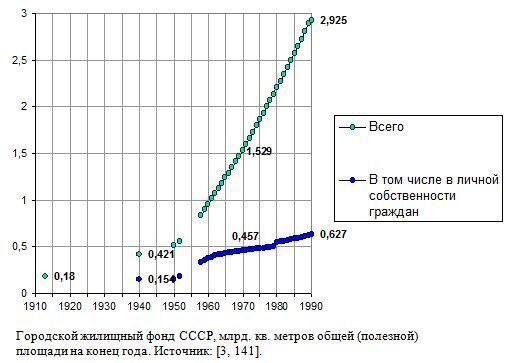 За 1913 - 1990 годы городской жилищный фонд в СССР увеличился более чем в 16 раз (данные за 1913 год, взяты для Российской империи) и достиг в 1990 году 2925 млн. м2 общей площади.