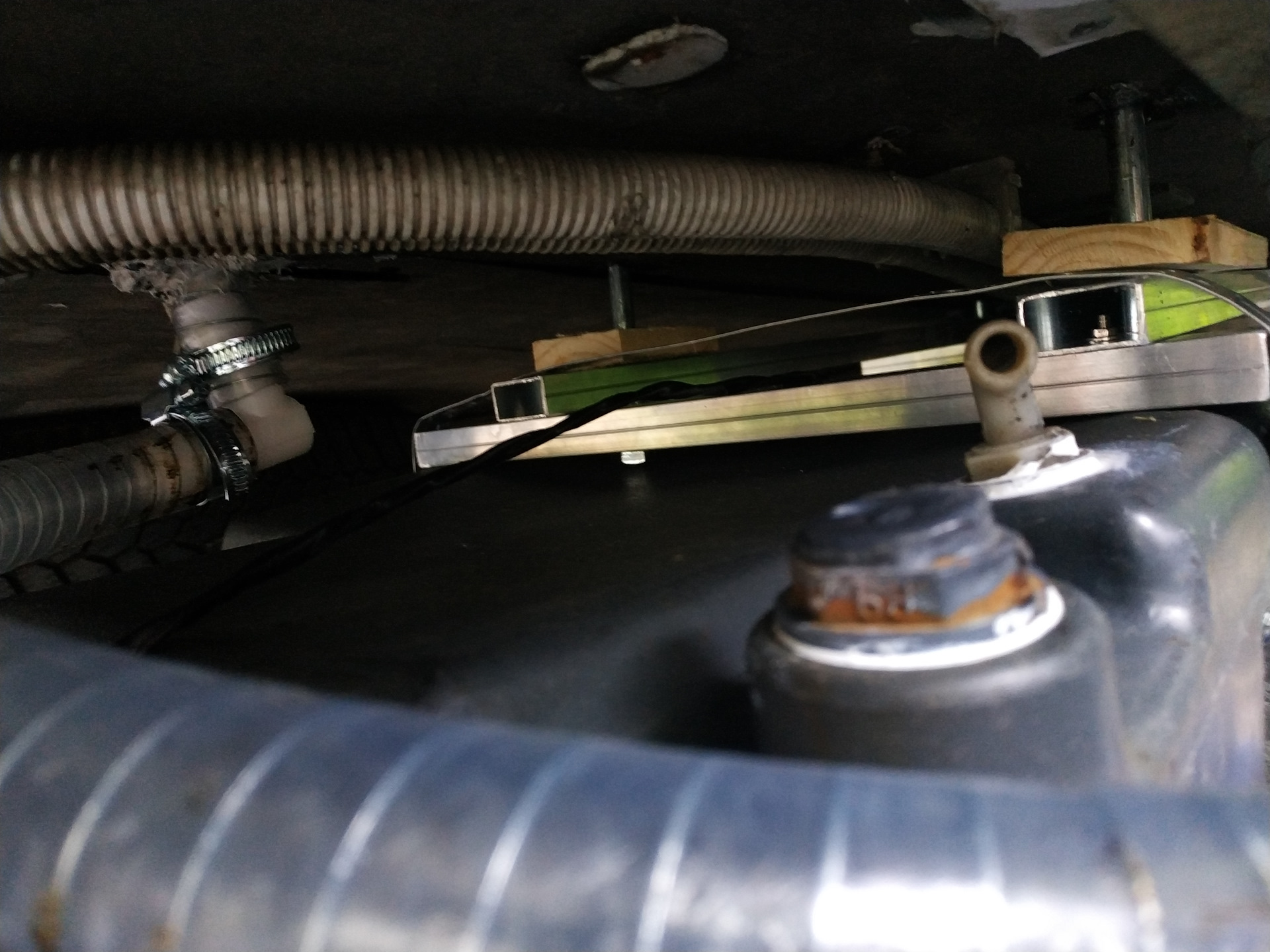 Из-за этого сильно выступающего уголка (выше его не поднять — там уже прямой выпуск из поддона мешает) пришлось подложить под раму деревянные "шайбочки", чтобы опустить бак ниже.