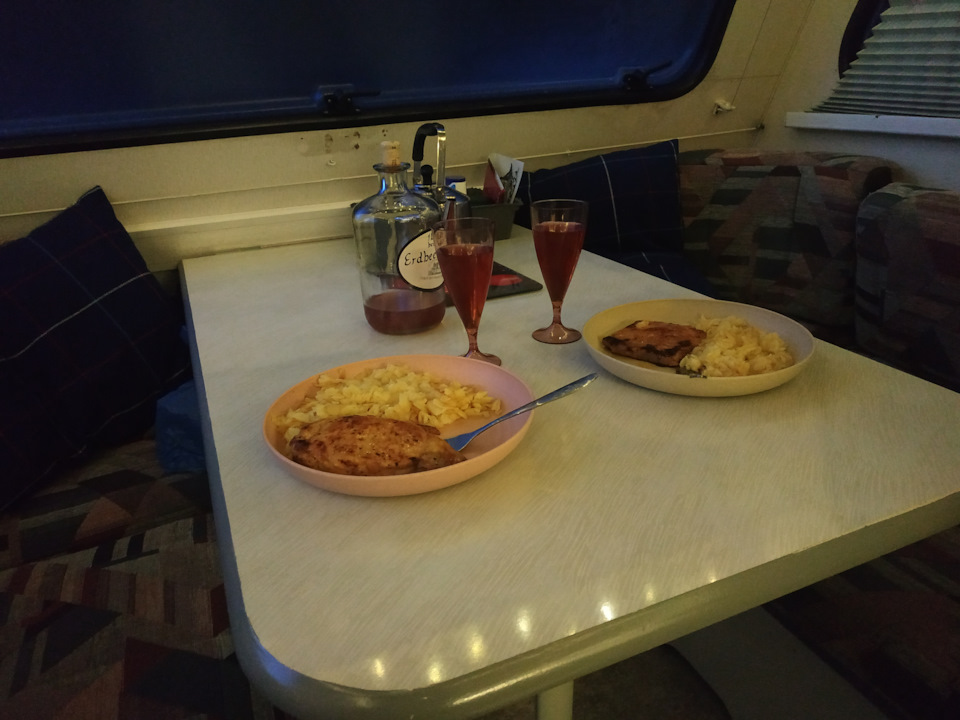 В первый вечер на озере сделали свиные стейки с картошечкой и винишком: