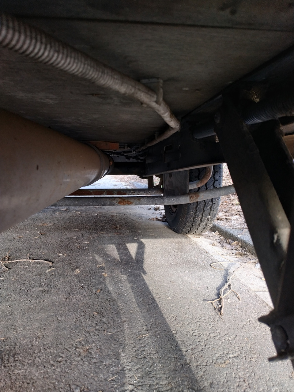 Направо уходит гофра с сигналами задних фонарей. Налево гофра с 220В и остальными проводами. Эти две гофры приходят к коробкам, над которыми я ставил аккумулятор.