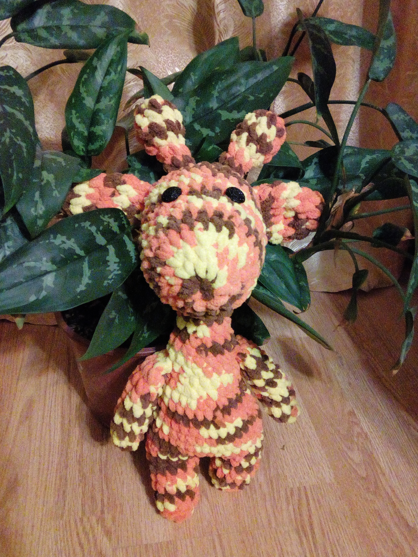 Вдохновилась здесь плюшевыми игрушками. Решила попробовать и заодно освежить навыки, давно не бралась за крючок. Рослый малый получился, 42 см с рожками. Думаю, на первый раз после долгого перерыва в вязании, вполне неплохо получилось (не без косяков, конечно). Главное - дочка в восторге.