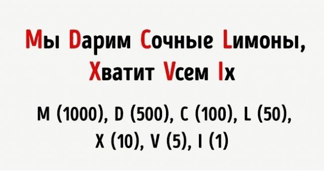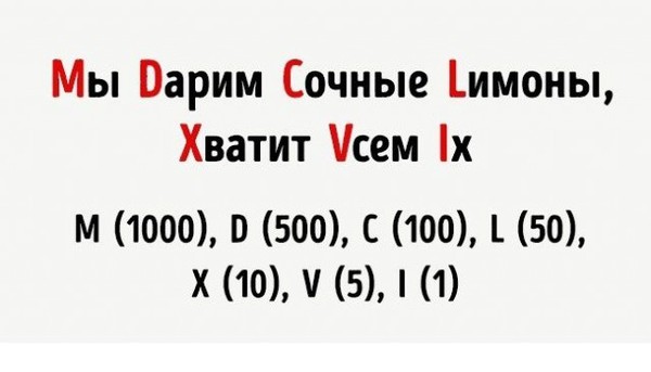 Для запоминания римских цифр и чисел можно использовать такую фразу: Мы Dарим Сочные Lимоны, Хватит Vсем Iх. Первые буквы в словах означают римские цифры по убыванию: M (1000), D (500), C (100), L (50), X (10), V (5), I (1).