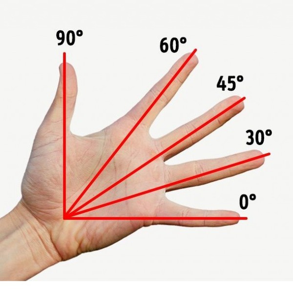Максимально расставьте пальцы и приложите к поверхности, на которой нужно измерить угол. Мизинец должен лежать на нижней плоскости: он обозначает 0°. Угол между большим пальцем и мизинцем будет равен 90°, углы между мизинцем и другими пальцами составляют, соответственно, 30°, 45° и 60°.