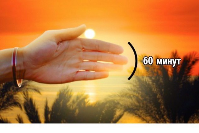Сложите пальцы вместе и вытяните руку так, чтобы солнце «лежало» на указательном пальце. Теперь посчитайте количество пальцев до линии горизонта. Каждый из пальцев будет равен приблизительно 15 минутам до заката.