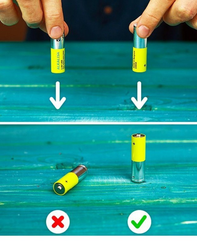 Отличить хорошую батарейку от плохой очень просто. Поднимите две батарейки на 1–2 см над столом и отпустите. Та батарейка, которая отскочит и упадет, разряжена.
