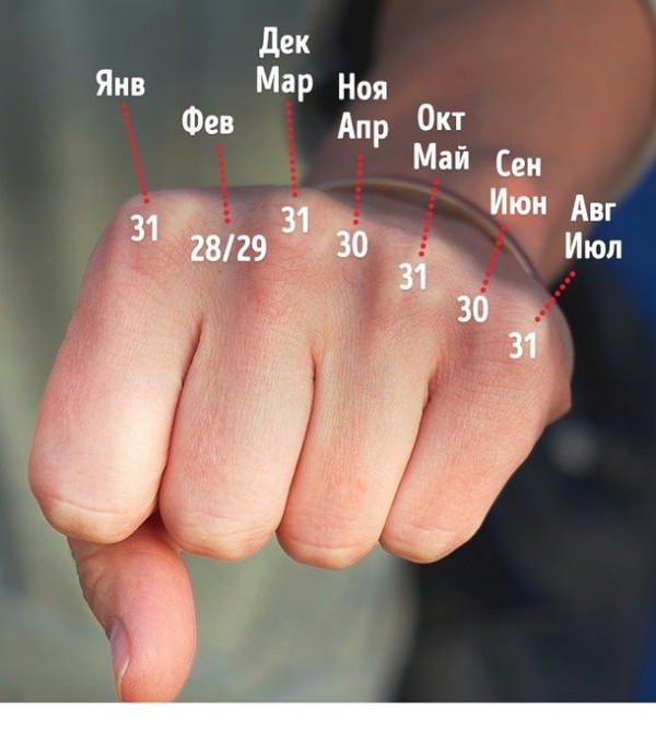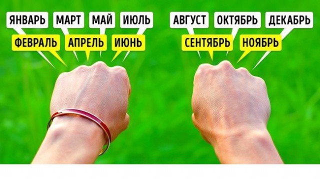 Сожмите руку в кулак и начните считать месяцы по костяшкам пальцев. Каждая костяшка и впадина — это отдельный месяц. Если вы считаете по одной руке, то, дойдя до конца, снова начинайте с костяшки указательного пальца.