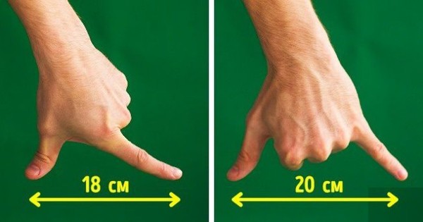Если вам нужно приблизительно измерить предмет, но под рукой нет линейки, то для этого можно обойтись пальцами одной руки. В соответствии с пропорциями человека, расстояние между кончиками большого и указательного пальцев равняется примерно 18 см, а расстояние между большим пальцем и мизинцем — около 20 см.