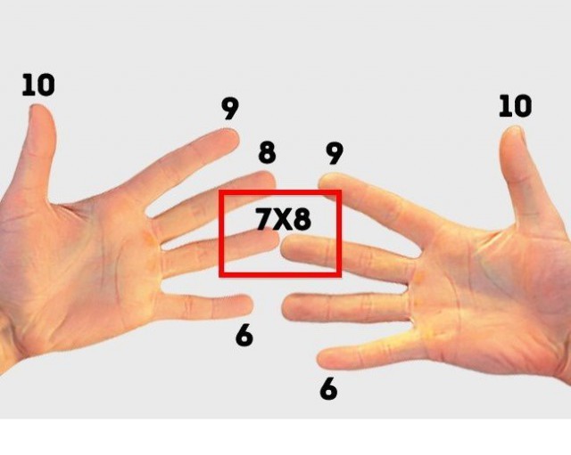 Поверните руки ладонями к себе и пронумеруйте каждый палец, начиная с мизинца, от 6 до 10. Теперь, чтобы, например, умножить 7 на 8, соедините палец № 7 на левой руке с пальцем № 8 на правой. Количество пальцев внизу, считая вместе с соединенными, обозначает десятки (у нас их получилось 5). А пальцы, расположенные вверху, нужно перемножить между собой — они обозначают единицы (в нашем случае умножаем 3 на 2). Ответ: 7×8 = 56.