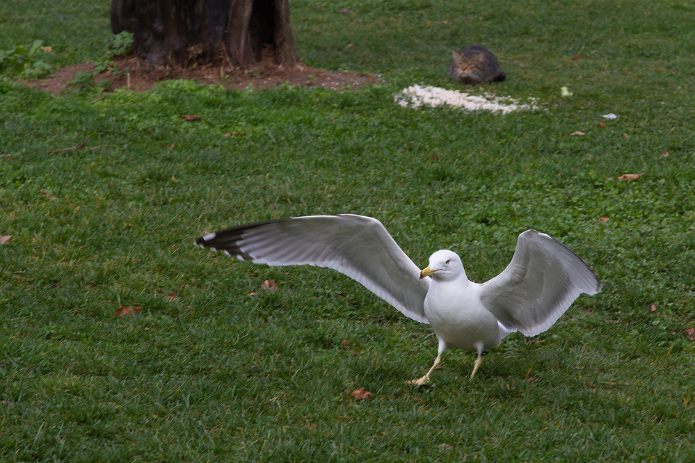 Кот на заднем плане делает вид, что охотится, но на самом деле он не такой дурак. А то там еще не ясно, кто кому рожу расцарапает - чайки себя в обиду не дают.
