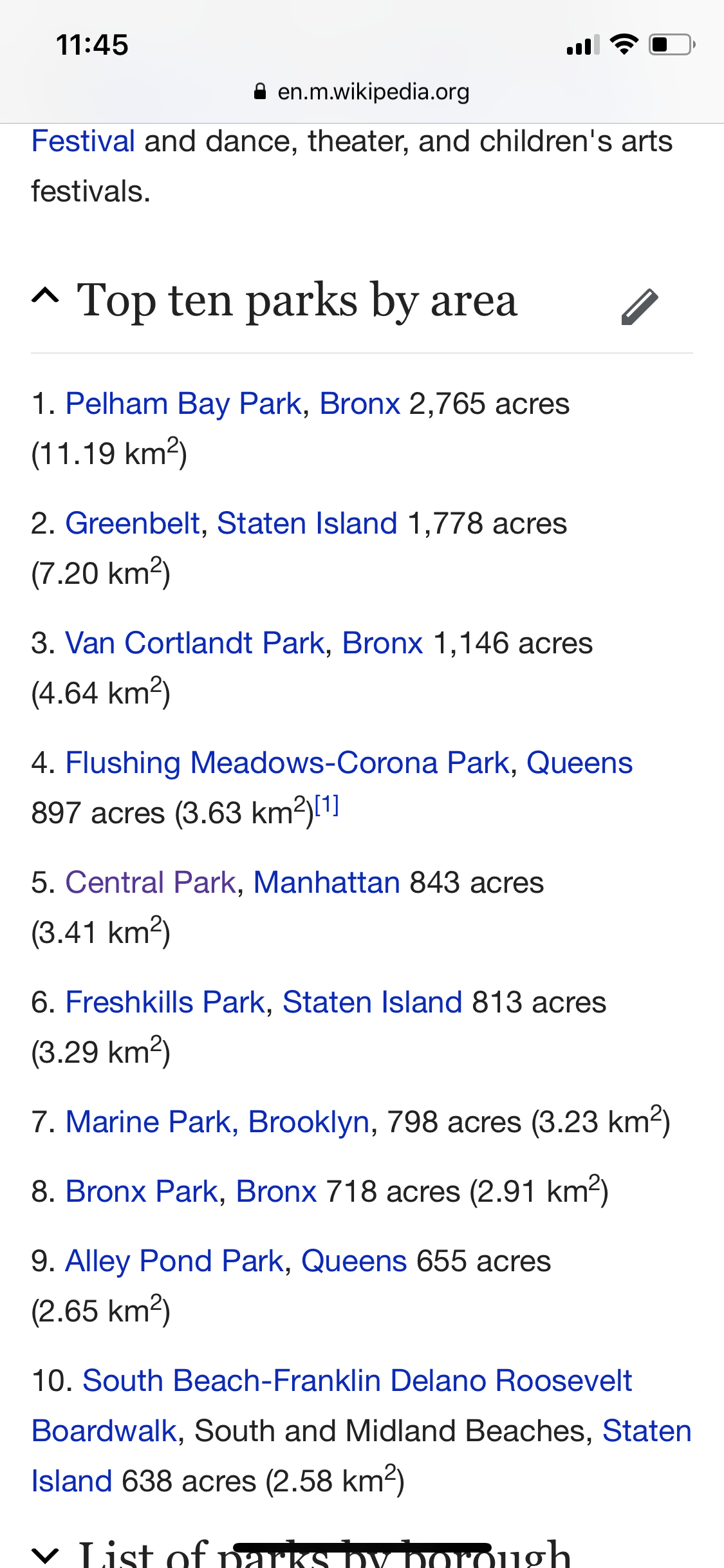 Мм, не знаю, мне трудно сравнить с каким то другим городом чтобы сказать много здесь парков для города миллионика или мало, но вот список десяти самых больших парков НЙ (и Централ Парк далеко не самый большой). Если все сложить то парки в НЙ занимают площадь больше 10,000 акров, плюс всякие скверы.. наверно это не так мало для города в котором живет 8.5 миллионов