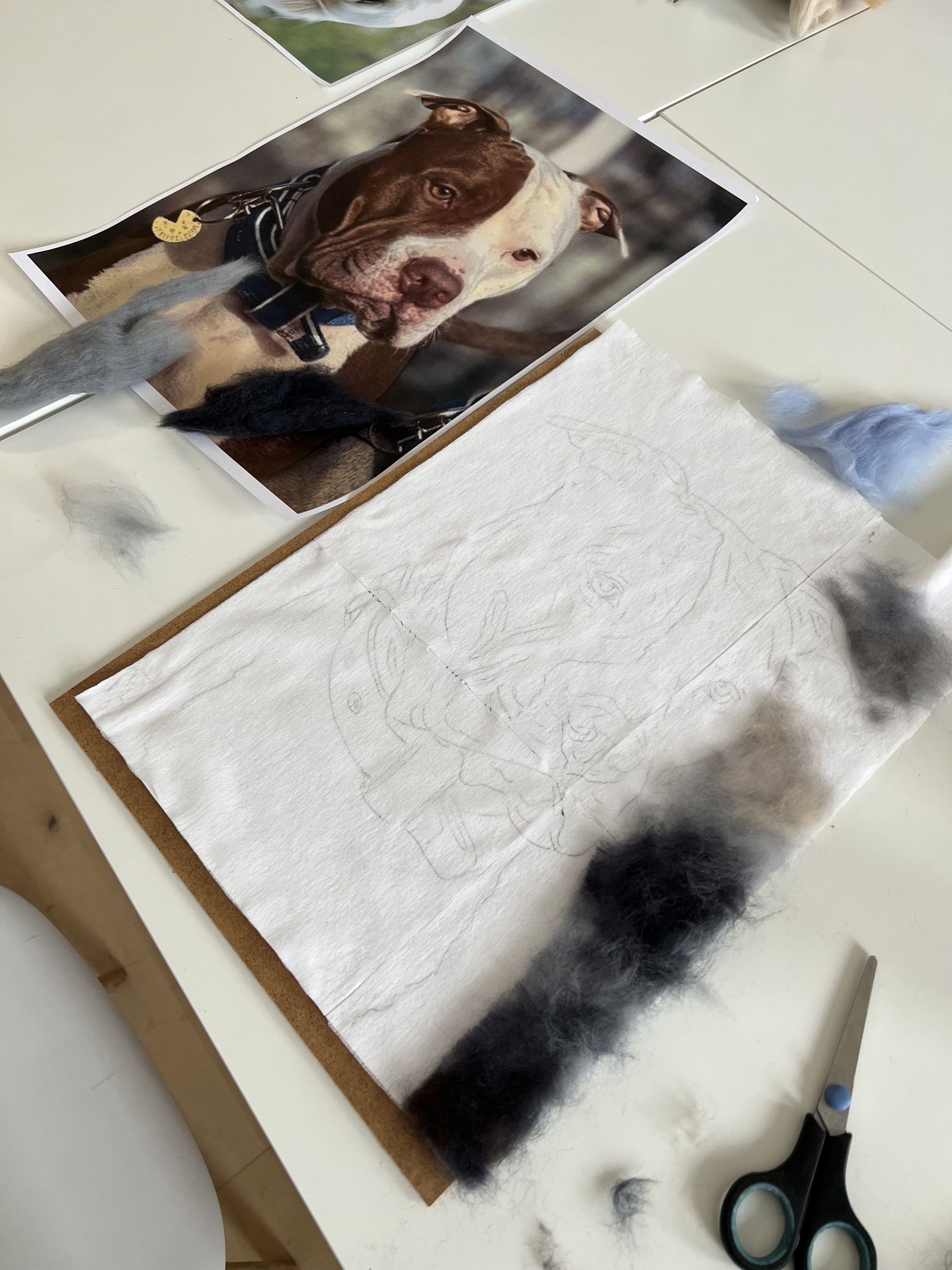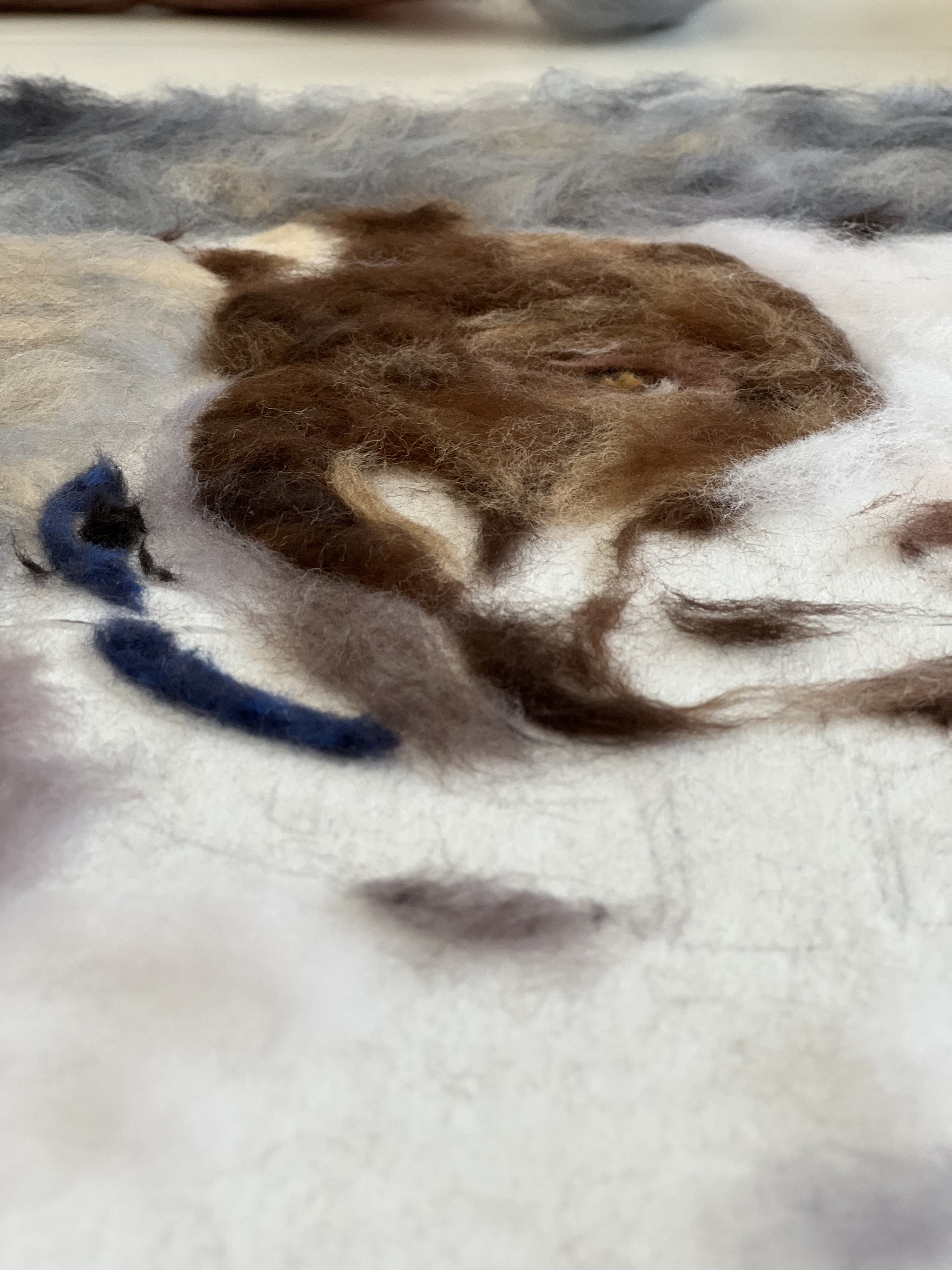 Первым делом устали пальцы, рвать и перемешивать шерсть. Потом сдалась шея, тк процесс весь в горизонтальной плоскости, чтобы шерсть не падала тк она просто лежит на нетканом основании и ничем не закреплена. Потом спина и часам к 4м дня я понимала, что не успеваю и надо ускоряться. На этом этапе Анна (автор) помогла мне сделать ошейник и вообще она подходила и как мастер штрихами там и тут, поправляла некоторые места.
