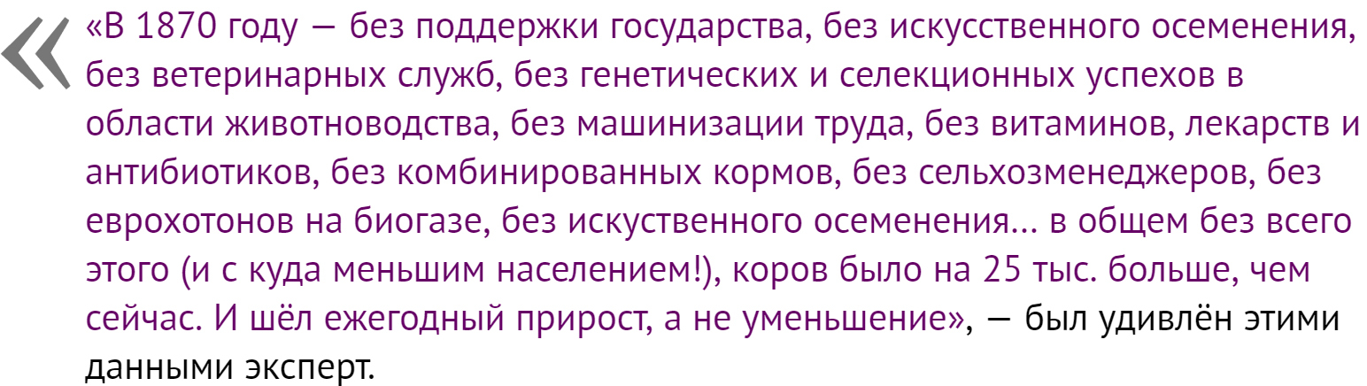 ЯКУТСК, 6 декабря 2018, 08:33 — REGNUM Якутии не помогают развивать сельское хозяйство поддержка государства, искусственное осеменение, ветслужбы, генетика и селекция, машинизация труда, витамины, лекарства для животных, селькозменеджеры и еврохотоны на биогазе. К такому выводу пришёл политолог и журналист Виталий Обедин, ознакомившись со статистикой поголовья КРС в республике в 1870—1879 годах, сообщает корреспондент ИА REGNUM.