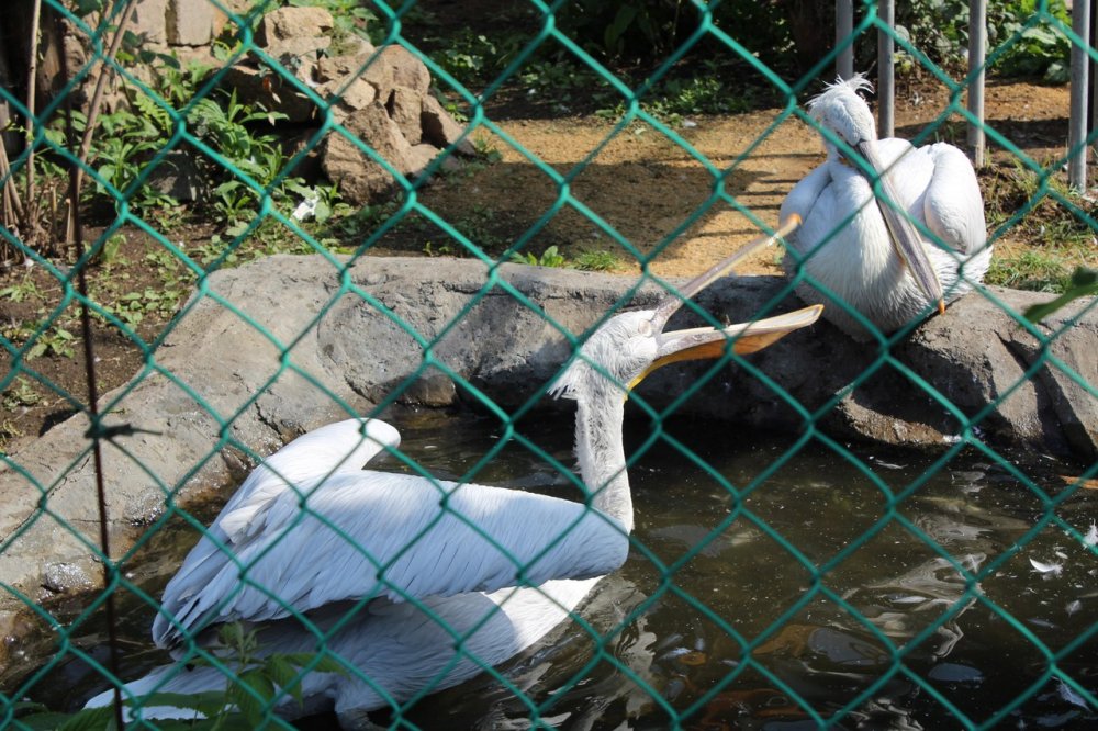 в вольере сидят 2 пеликана, один барахтается в прудике, второй дремлет неподалеку.