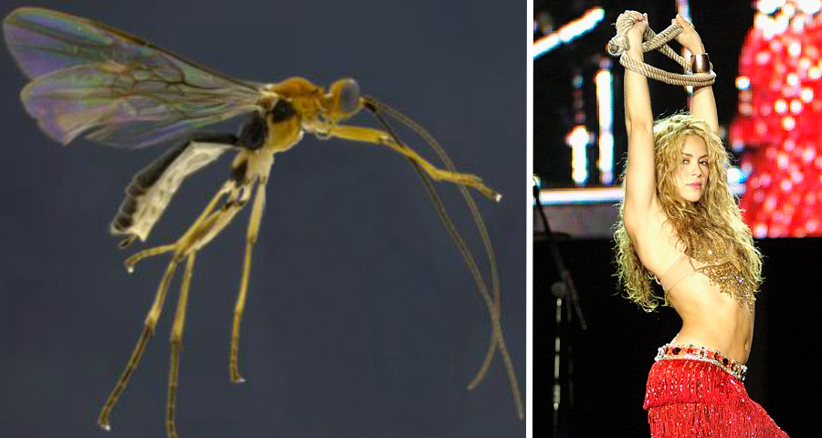 "Aleiodes shakirae" -крошечная оса (4-5 мм в длину) , обнаруженная на востоке Эквадора. Названа в честь певчихи Шакиры за свои шикарные бедра (шутка). Самка осы откладывает яйца в гусениц, когда личинки развиваются -гусеница умирает и начинает в присмертных конвульсиях танцевать как Шакира, во всяком случае учёные так решили...