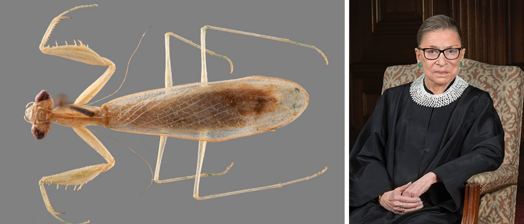 "Ilomantis ginsburgae"- этот вид богомола из Мадагаскара имеет сходство с верховной судъей Рут Бейдер Гинзбург. Пластины вокруг насекомого похожи на жабо Рут.