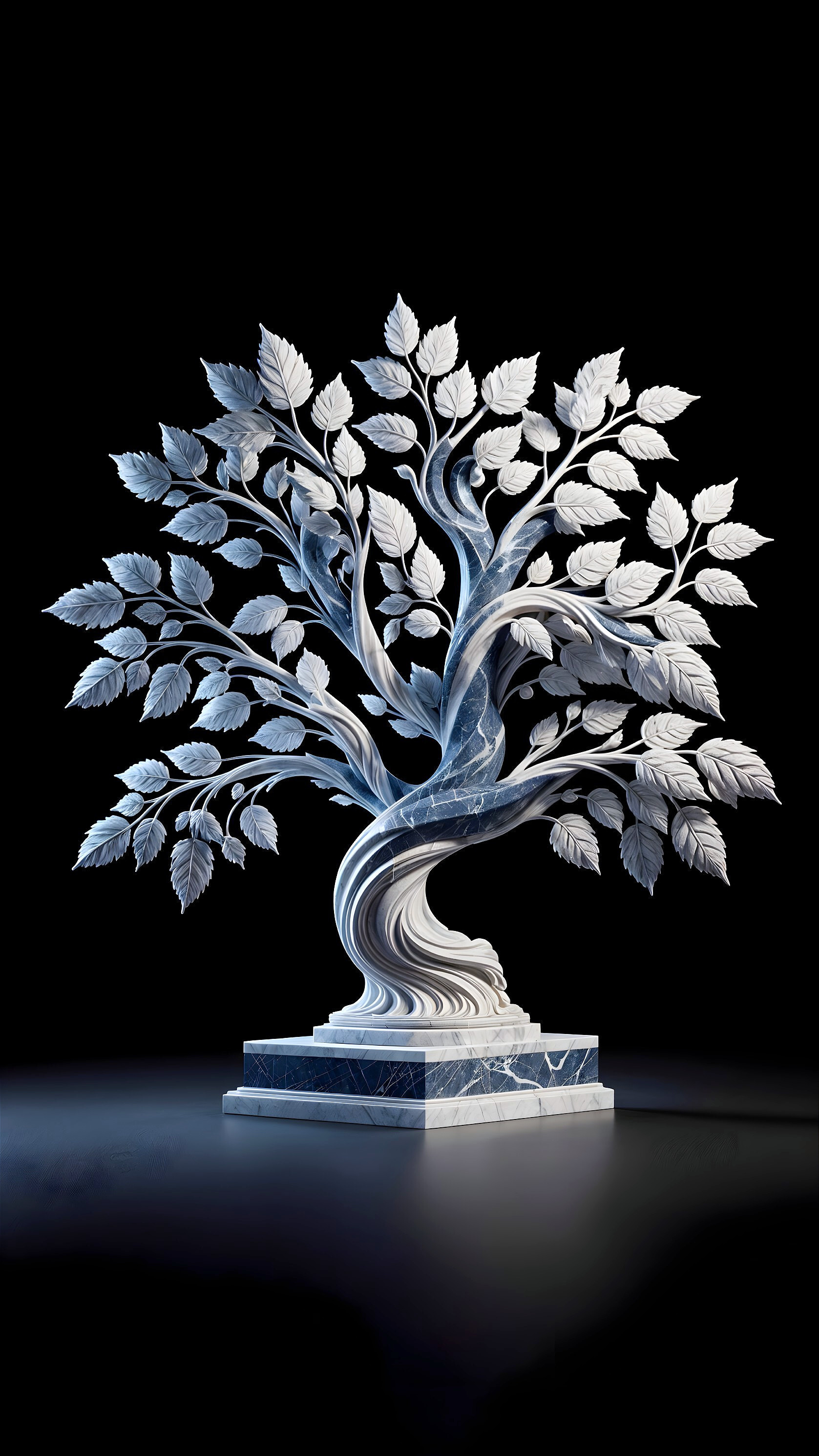 Prompt: Plane tree branch sculpture, carrara marble, detailed foliage, blue-gray marble, white veins, lifelike leaves, Classicist style, full frontal view, single block carving, intricate twig details, smooth finish, rough block contrast, epic proportions, museum-quality, masterful craftsmanship, HD resolution, no background.