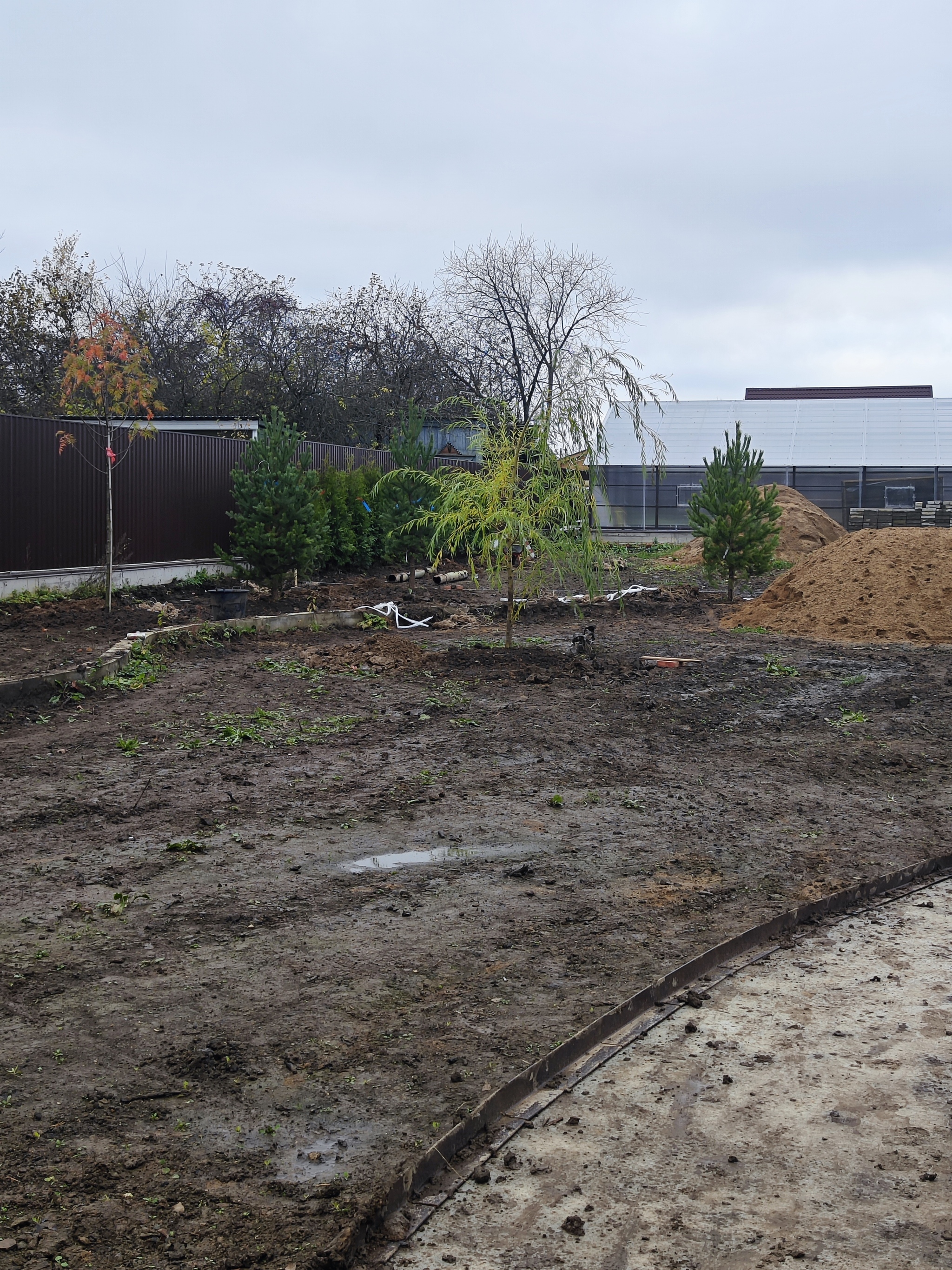 И вот дорожки залиты, коммуникации закопаны. Можно сажать, но на дворе осень, да только кого это когда останавливало?