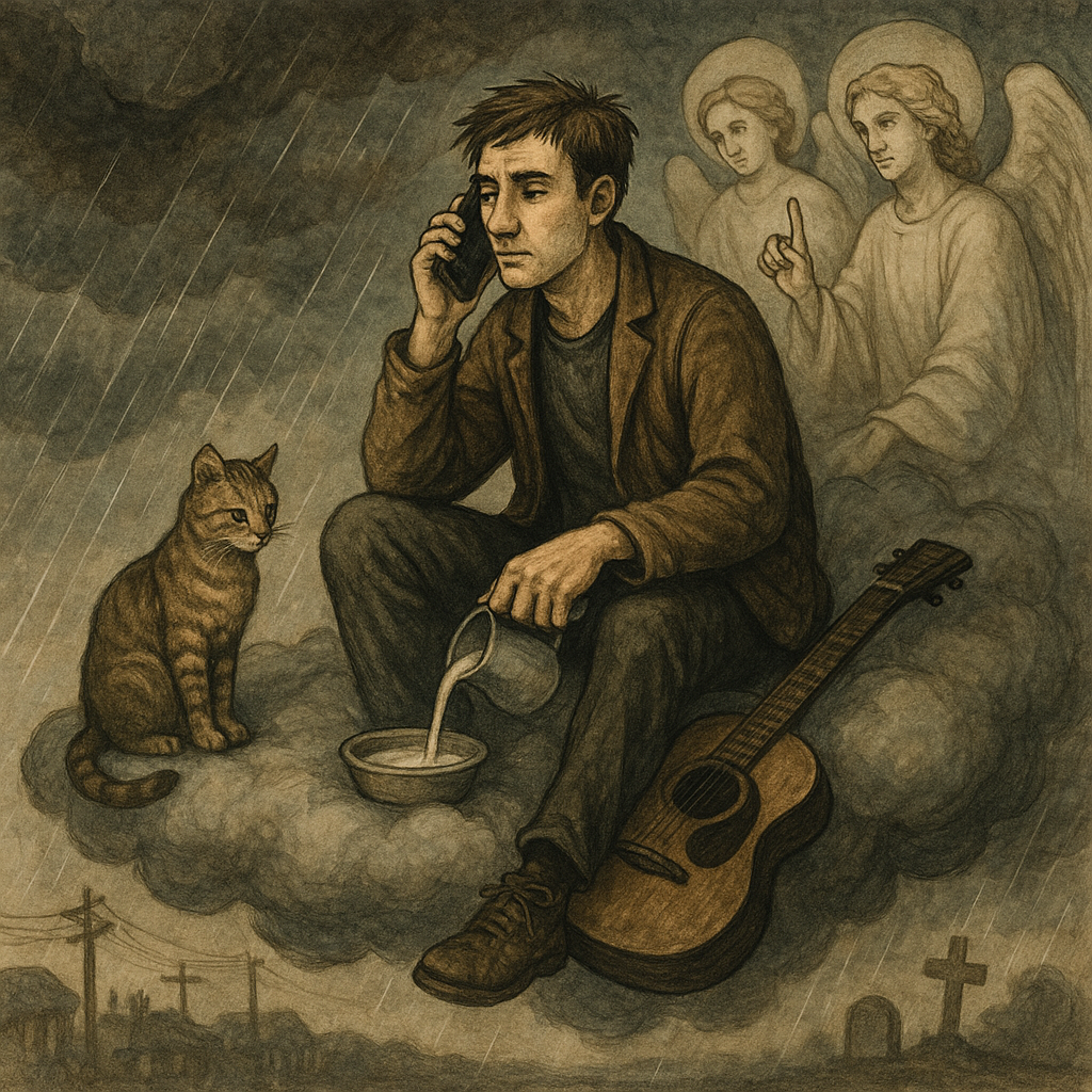 И тут, как в хорошем клипе, пошел дождь. Я вышел на балкон, весь в мыслях. Не то чтобы я собрался умирать — просто такое чувство, что мир сегодня слишком литературный. Даже кошка смотрела на меня как будто знает что-то.