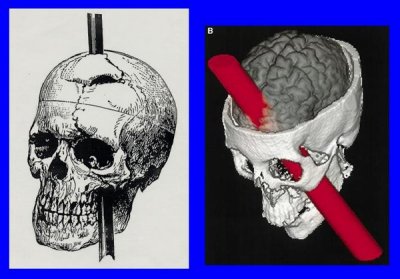 Финеас Гейдж — американский строитель, получивший тяжёлое ранение головного мозга при прокладке железной дороги. Металлический прут диаметром 1,25 дюймов (3,2 см) вошёл в череп ниже левой глазницы, выходное отверстие раны располагалось на границе лобной и теменной костей также с левой стороны. Из-за ранения строитель лишился большей части лобной доли левого полушария головного мозга. Несмотря на столь тяжелые повреждения, пострадавший пришёл в сознание спустя несколько минут после травмы и уже через два месяца смог вернуться к активному образу жизни.