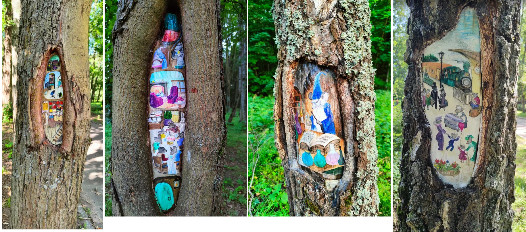 Первые две картинки на одном дереве с разных сторон, мышиный дом с комнатами. На последней картинке есть несколько отсылок к фильмам и известному рисунку. Качество фото, к сожалению, неважное. Вживую выглядит забавно