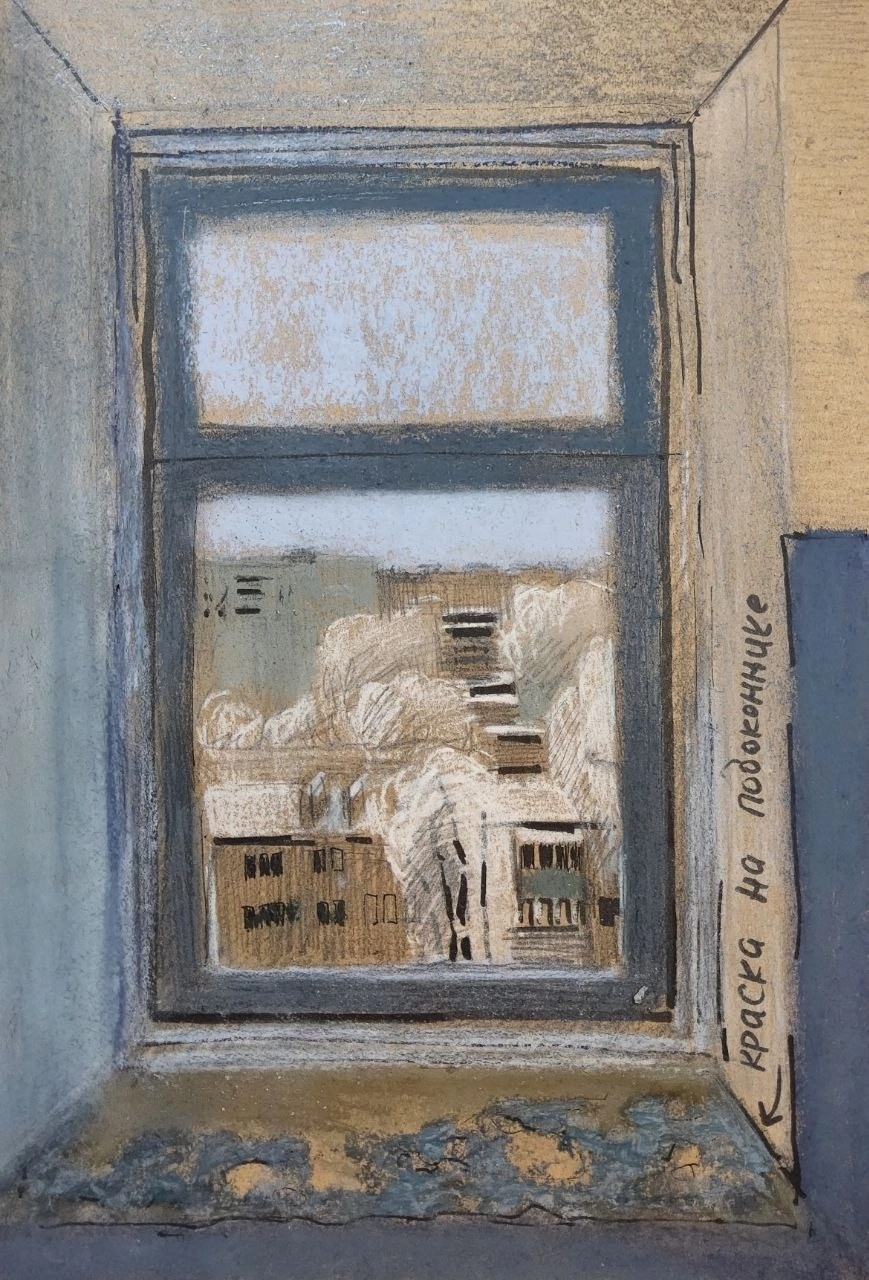 Вид из окна , с 11-го этажа, и облупившаяся краска на подоконнике .