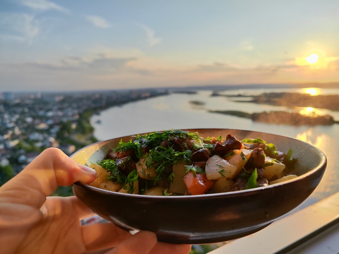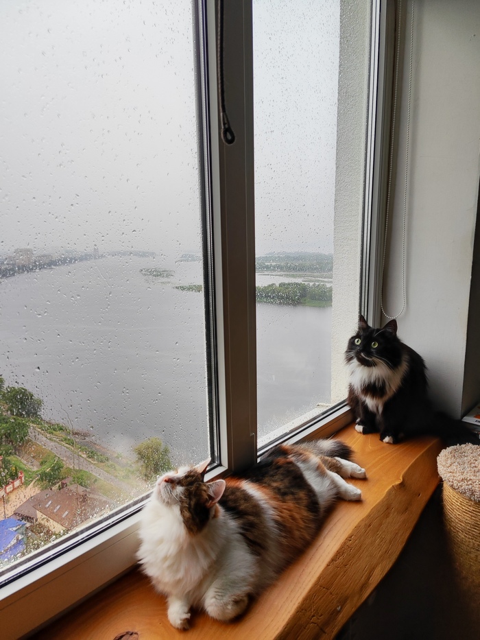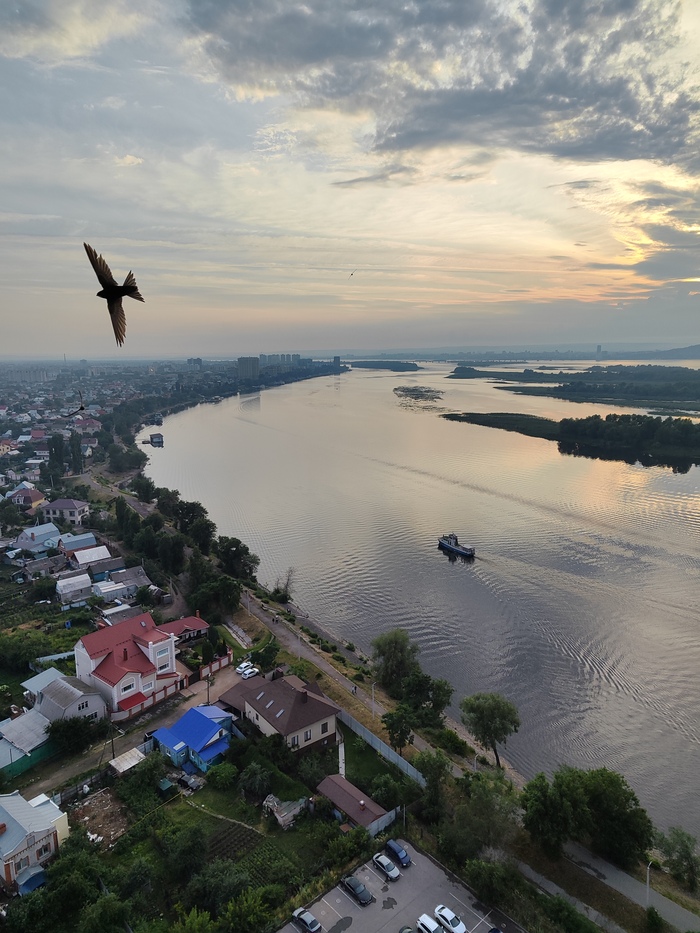Вид, конечно, радует. Телевизора у нас нет, но он и не нужен. Канал Дискавери каждый день за окном. Движуха на Волге, грозы, радуга, стройка домов, пожары, фейерверки - все, что угодно показывают. Кот в шоке от близости птиц, до которых лапой подать.