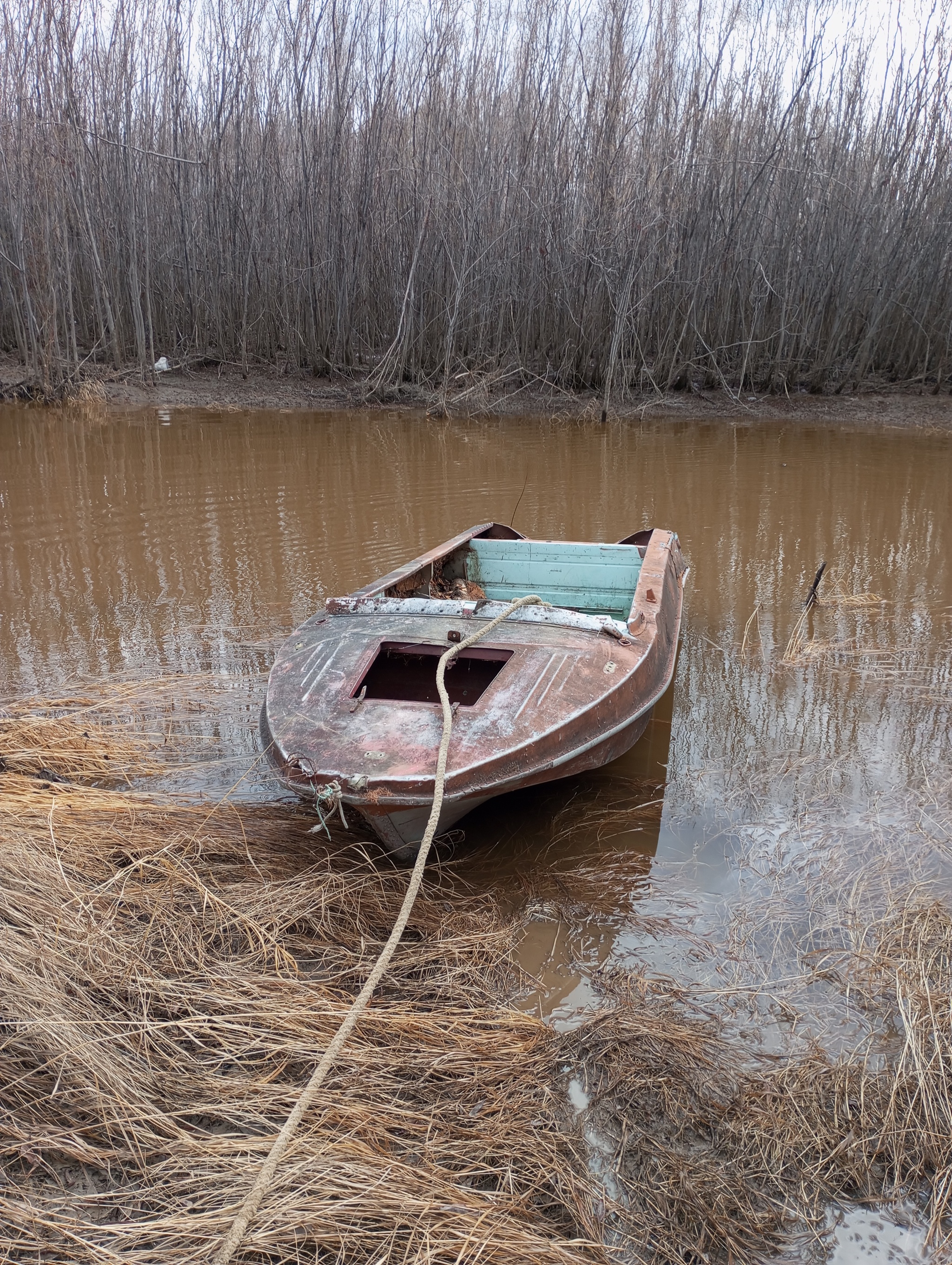 По пути на гидропост, около тропинки, лежала лодка. Не знаем кто и когда её оставил. Всё время, что мы находились на станции, она лежала на своём месте.