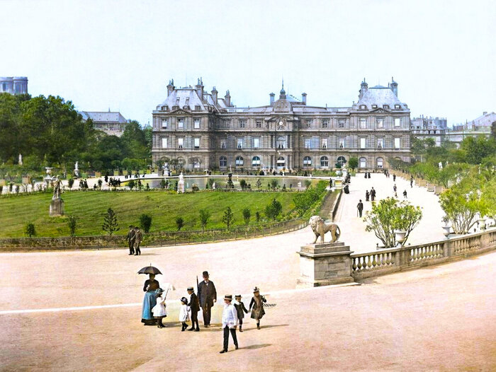 На фотографии изображены люди, прогуливающиеся по Люксембургскому саду, на заднем плане - Люксембургский дворец ,1880 год.