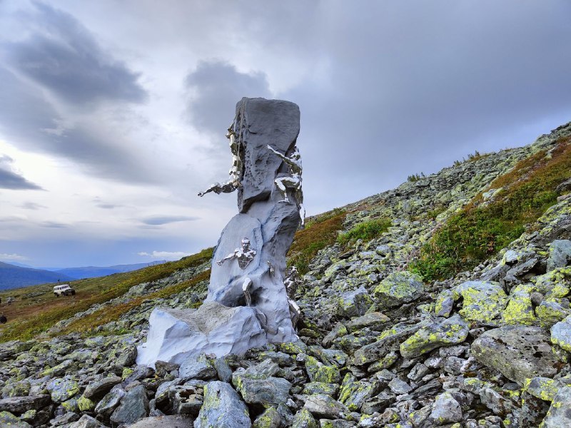 На перевале, на скале, прикреплена табличка в память о группе Дятлова. На горизонте - мрачная неживая гора Хохлатчахль, за которую цепляются облака.