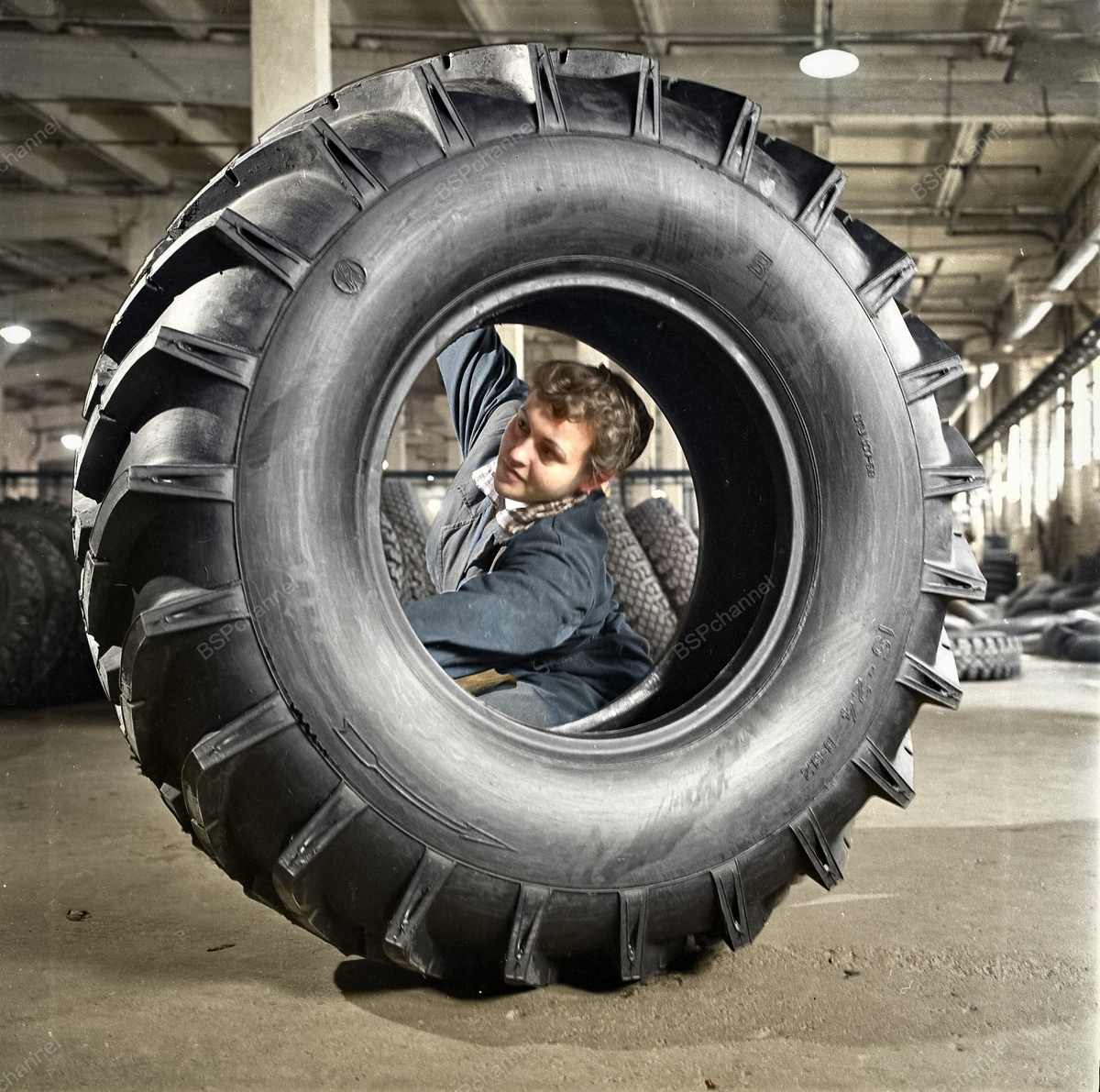 Бракер ОТК Г. Ф. Тельникова проверяет качество покрышек для передних колес комбайна "СК-3"