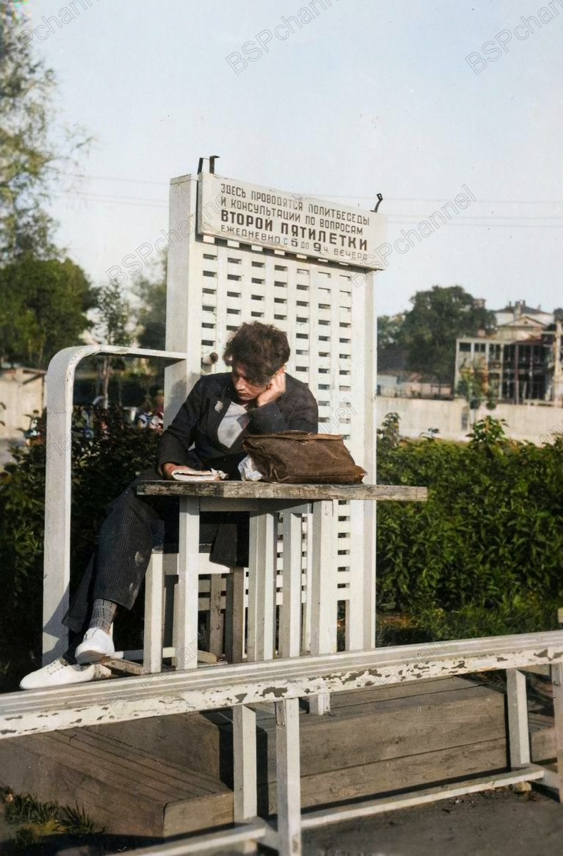 Юноша, читающий книгу на месте проведения полит бесед и консультаций по вопросам второй пятилетки в парке культуры имени Горького. Москва, 1935 год.