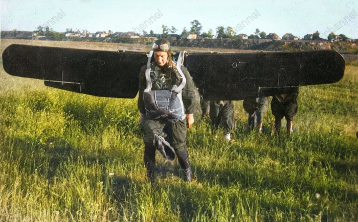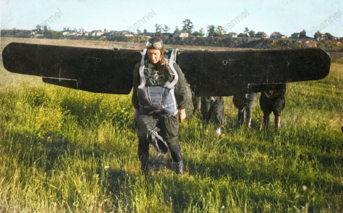 Конструктор крыльев для десантников Санфиров на испытаниях. Тушинский аэродром, Москва, 1935 год.