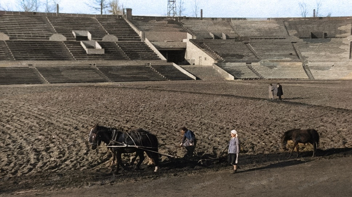 Работники стадиона "Динамо" сеют газон. Москва, 1931 год.