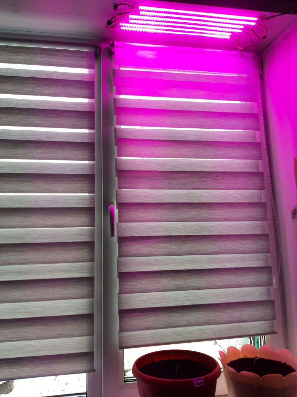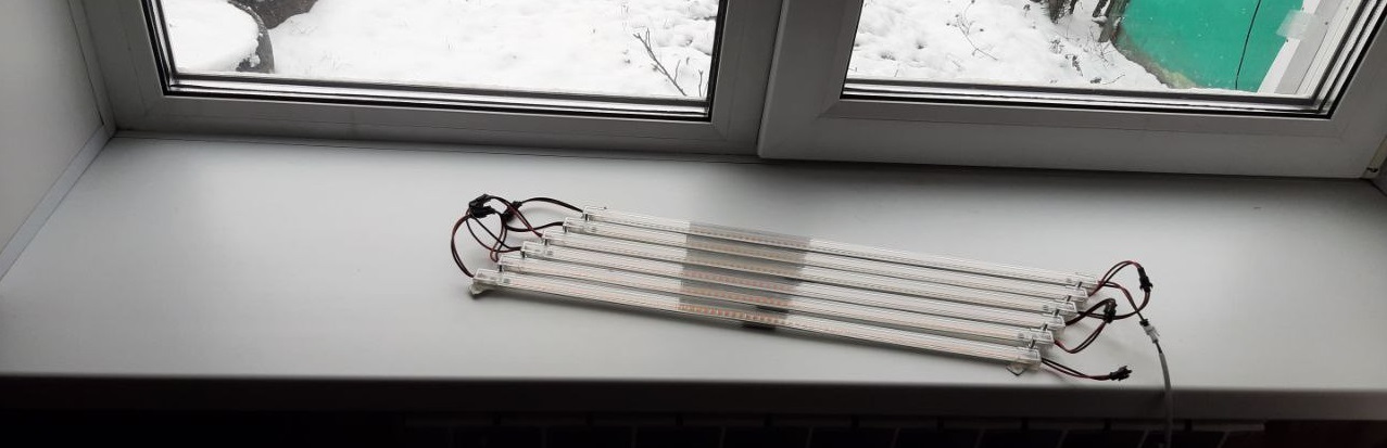 Грунт состоит из простой земли с участка, предварительно обработанной в духовке при 90 градусах в течении часа. Иными словами - мертвая часть, просто наполнитель. Её примерно 50%. Смешана она с 20% песка и по полтора стакана древесной золы в каждый горшок, биогумусом (червями который произведен) 1.5 литра на горшок и остальное обычный универсальный грунт с магазина. Эта смесь настаивалась, где-то с неделю, после смешивания компонентов. Под семечки, перед посадкой еще немного биогумуса подсыпал. Сейчас монтирую фитолампы, 6 плашек соединил и вверху подоконника приклею на двухсторонний скотч