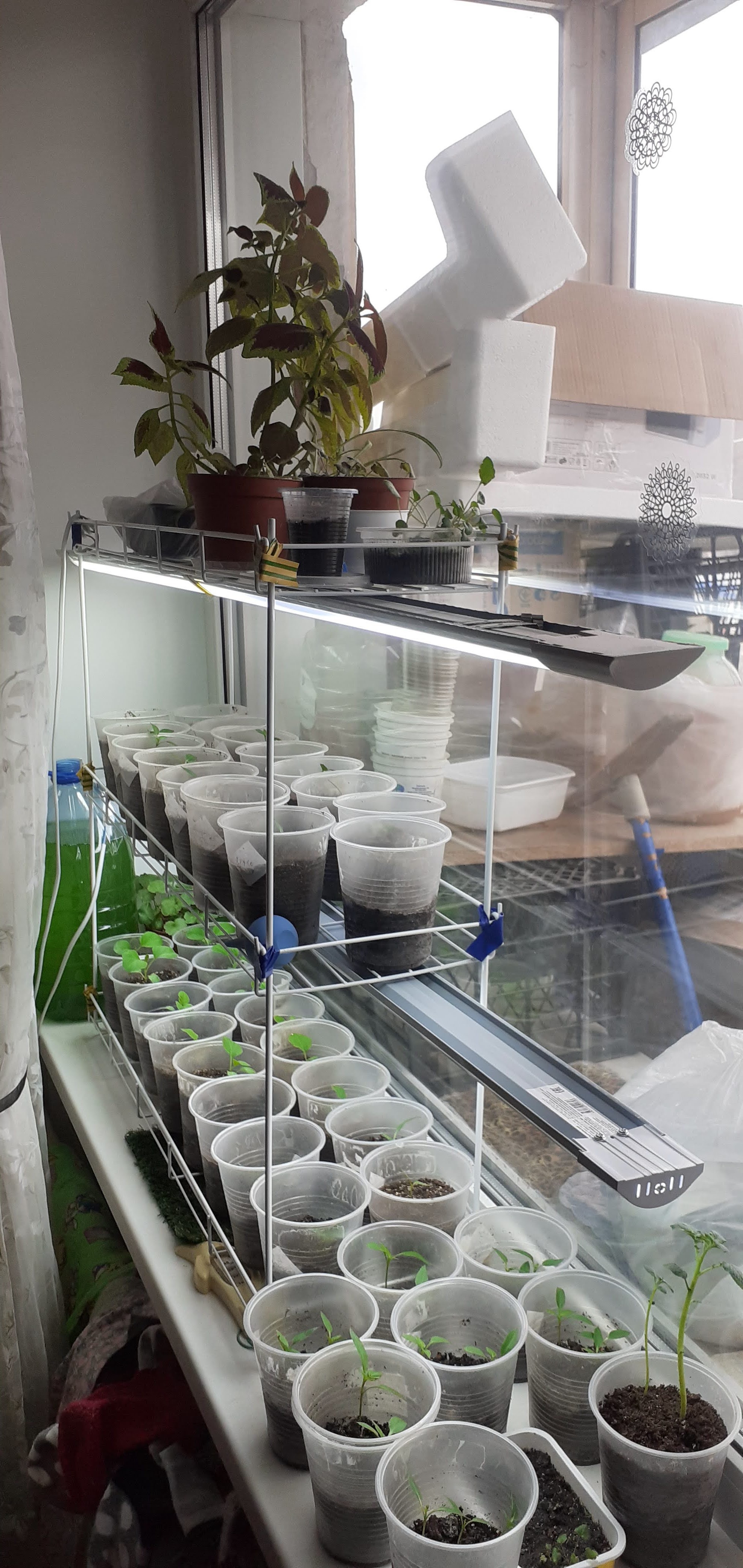 Грунт состоит из простой земли с участка, предварительно обработанной в духовке при 90 градусах в течении часа. Иными словами - мертвая часть, просто наполнитель. Её примерно 50%. Смешана она с 20% песка и по полтора стакана древесной золы в каждый горшок, биогумусом (червями который произведен) 1.5 литра на горшок и остальное обычный универсальный грунт с магазина. Эта смесь настаивалась, где-то с неделю, после смешивания компонентов. Под семечки, перед посадкой еще немного биогумуса подсыпал. Сейчас монтирую фитолампы, 6 плашек соединил и вверху подоконника приклею на двухсторонний скотч