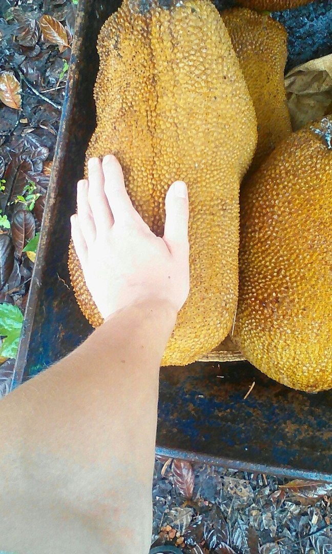 Для начала - это моя рука на фоне джекфрута. Внутри этого шипастого монстра - сьедобные дольки. По текстуре и запаху напоминают что-то луковое, по вкусу - дыню. Сок дерева - каучук, при попадании на волосы вызывает желание спилить все деревья джекфрута к хренам.