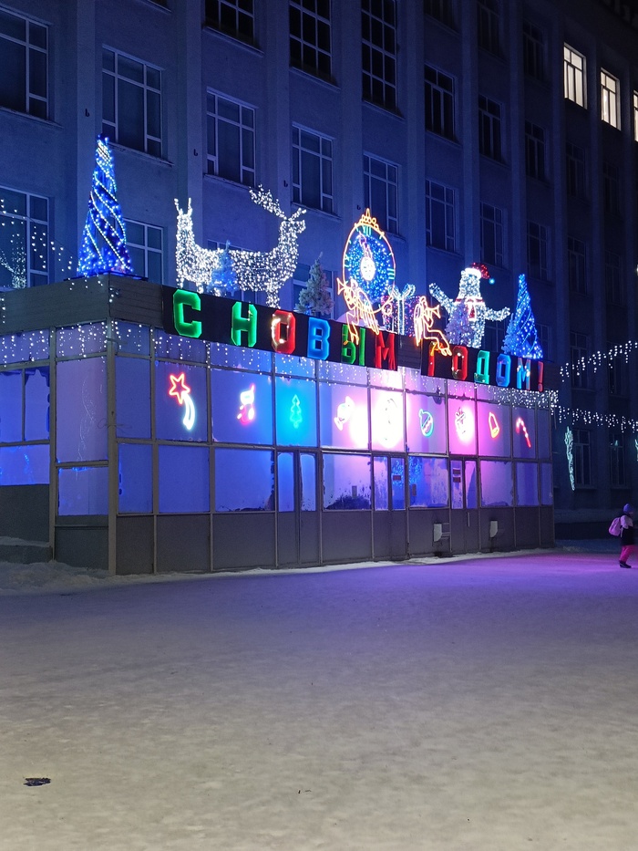 Дворец творчества детей и молодежи, украшенный к Новому году. Раньше еще ставили восхитительного снеговика из преисподни с горящими глазами, но чем-то он не угодил, видимо.